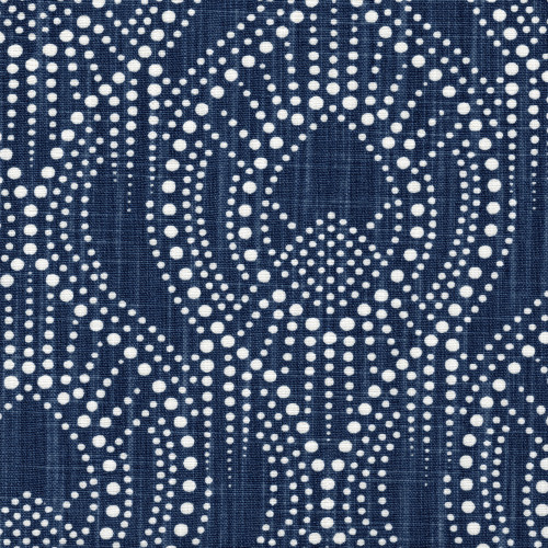Alyssa's intricate dotted pattern features a contemporary design using a variety of unique shapes and curves. The fabric is a cotton slub canvas in soft navy blue and white.