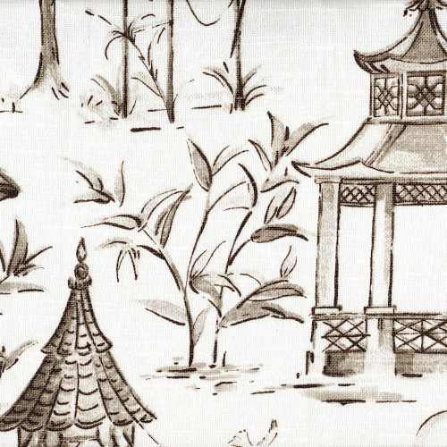 Pagodas Bisque is a delightful Oriental toile in shades of gray with a hint of taupe for warmth. It has the look of a fine watercolor drawing, and the linen-like texture of the off-white cotton slub fabric makes the perfect background. The largest pagoda measures approximately 7” x 10”.